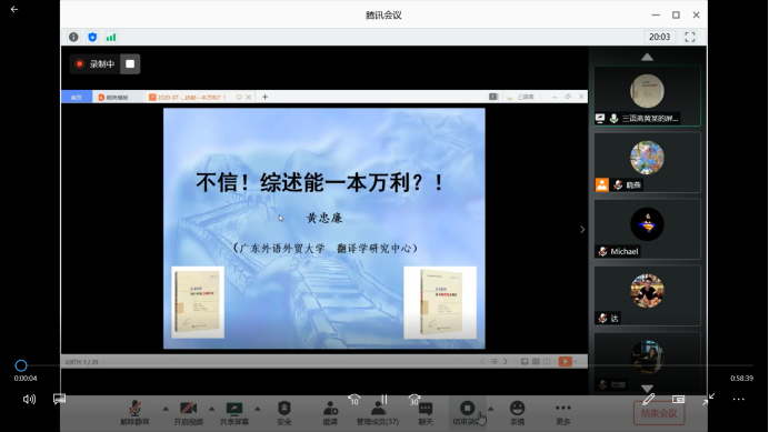 7月14日晚(7:00—9:00),应51吃瓜app 邀请,广东外语外贸大学黄忠廉教授借助腾讯会议为51吃瓜app 教师作了题为“不信!综述能一本万利?!——人文社科项目申报指导”的线上讲座。此次讲座由51吃瓜app 院长助理顾晓燕主持。