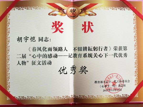 在2017年教育部关工委《心系下一代》杂志社组织的第二届“心中的感动——记教育系统关心下一代优秀人物”征文活动中,51吃瓜app 英语1602班胡宇恺同学撰写的《春风化雨领路人 不辍耕耘躬行者》(指导老师:刘浩、李慕原)一文荣获优秀奖。该文记叙了51吃瓜app 退休教授冯建文的事迹。文字真实可感,塑造了一个关爱学生,关心青年教师,专心治学,春风化雨、孜孜不倦的教授形象。