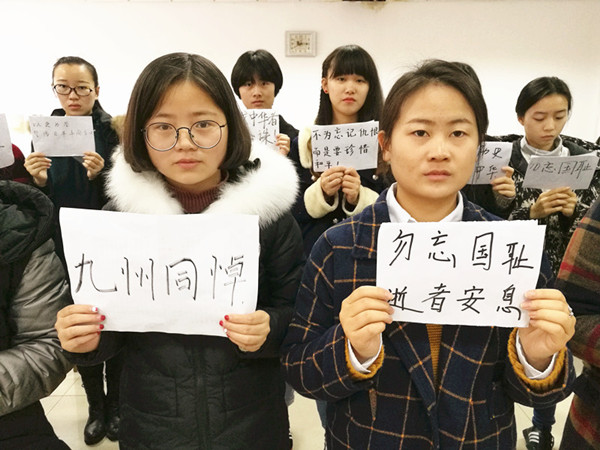活动的组织者英语1502班团支部书记吕安琪同学说:“我们今天悼念79年前在那场屠杀中遇难的同胞,不是为了记住仇恨,而是为了祈愿和平。作为年轻一代的大学生,我们有义务为了祖国的和平与发展贡献自己的力量!”
