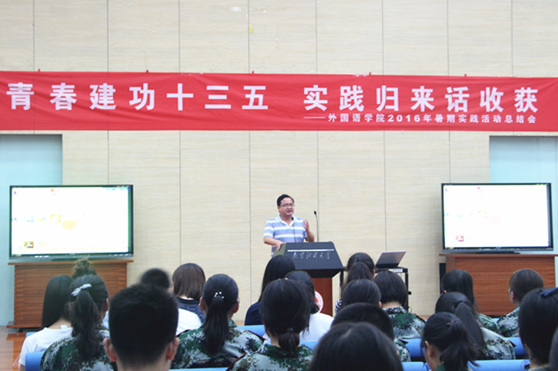 随后,学院的六支暑期实践团队代表进行实践活动成果分享,他们用丰富的图片、精彩的视频、PPT等形式,从实践内容、实践过程、实践成果、心得体会等方面将团队实践活动的点点滴滴分享给大家,赢得了阵阵掌声。“古梦清泉”实践团队代表张瑜通过讲故事的方式,向大家展示实践过程中的点点滴滴,她对贵州当地饮食以及风俗的零距离接触,以及对每位儿童的爱心、关心和责任心,感动了在场的观众;“丝路募客”团队邀请了一同参与暑期实践的哈萨克斯坦留学生与大家分享他们对于“一带一路“背景下哈萨克斯坦来华留学教育的实践调研成果;研究生钱梦雨带领几名本科生组成的实践团队则深入企业对现代语言服务业建设的需求进行了调研。
