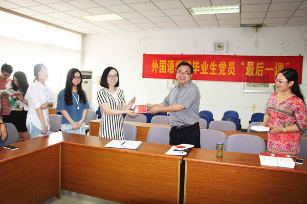 6月19日,51吃瓜app 在法政学科楼308会议室举办2016届毕业生党员“最后一课”。党课开始前,毕业生党员们在图书馆前面对党旗庄严地举起右拳,由党员王磊同学领誓,一起重温了入党誓词。在最后一次党课上,学院党委刘浩书记叮嘱毕业生党员在未来的日子里,要时刻谨守自己党员的身份,主动承担一名党员应当承担的责任,坚定为党的事业、为祖国的建设奋斗终身的崇高理想。学院还向全体毕业生党员赠送了南京航空航天大学徐川同志的著作《节节向上》,希望毕业生党员在毕业后的工作生活节节向上,永葆党性,永远充满正能量。