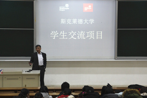 接着,他图文并茂地向同学们展示了斯特拉斯克莱德大学所在城市——古老的格拉斯哥的景色以及美丽的校园风景,让同学们感受到其浓厚的文化氛围。陆教授表示我校与英国斯特拉斯克莱德大学的国际交流合作项目对于同学们继续深造来说是一个很好的机会,国外求学经历有助于开拓视野,增长见识,提高语言能力。他鼓励同学们能够尝试参与其中,走出国门,走向世界。