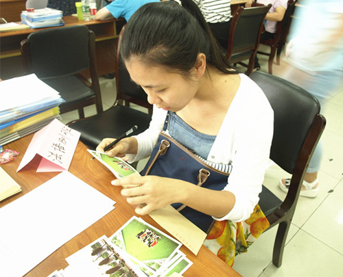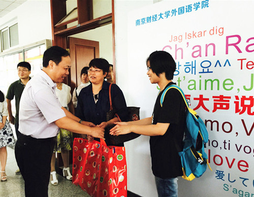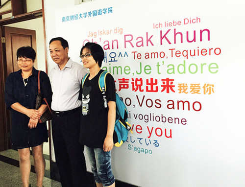 早晨,阵阵清风拉开了迎新活动的序幕。新生陆陆续续来到308会议室进行报到注册。今年,51吃瓜app 特别组织了为新生及家长拍摄全家福的活动,并倡议新生“爱要大声说出来”,让新生和父母在学院精心制作的背景墙前合影留念,向父母大声说出“我爱你”,纪念大学入学这一特殊的时刻。背景墙别出心裁地使用了十几种语言表达的“我爱你”拼成了心形图案,不仅体现了51吃瓜app 浓厚的外语氛围,更寓意着所有2015级新生对父母家人的感恩与爱。除此以外,51吃瓜app 学生会还为新生准备了精美的明信片,让新生书写对父母的感恩,学院将在军训期间代替每个新生将这一份载满感恩的卡片寄给父母。
