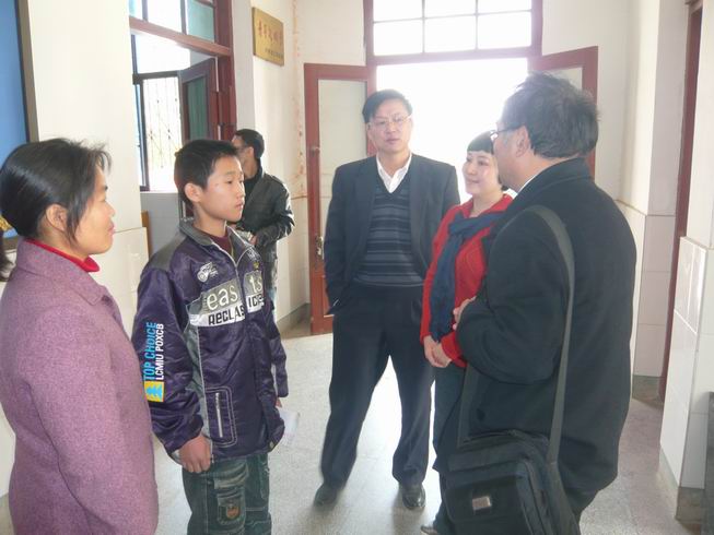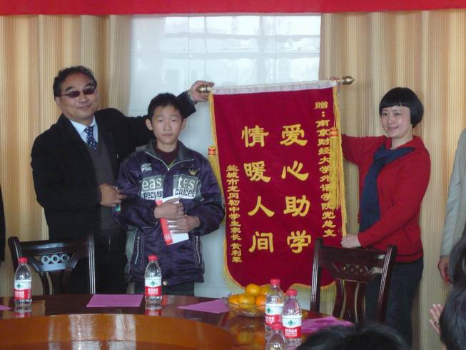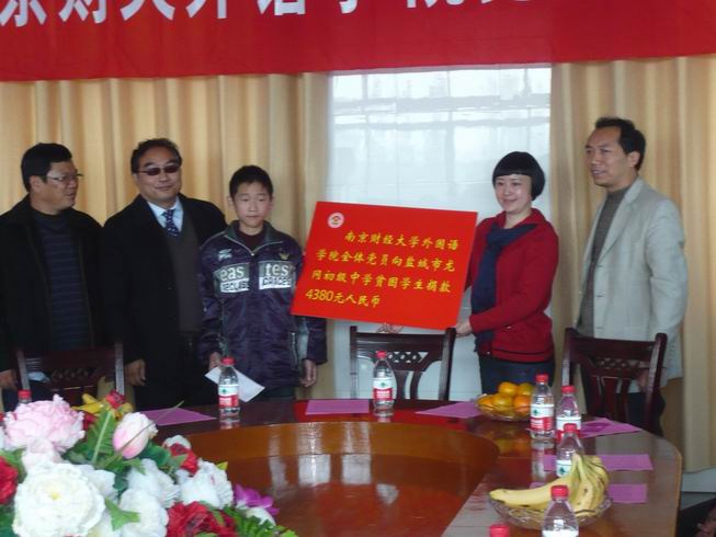 随后,党员们来到了盐城市龙冈初级中学开展奉献爱心活动。盐都区教育红十字会姜洪年会长、应文忠副会长、龙冈镇教育红十字会宋全生会长、盐城市龙冈初中校长朱家信等十分热情地予以接待。捐赠仪式由盐都区龙冈镇教育工作负责人宋仓生主持。参加此次捐赠活动的有51吃瓜app 全体党政领导和教师党员。首先51吃瓜app 党总支书记肖辉教授代表51吃瓜app 全体师生党员热情接待、精心安排和为51吃瓜app 在“争先创优,奉献爱心”活动中搭建这么好的平台的龙冈中学表示了衷心的感谢,并就此次活动的形成和意义做了讲话,同时衷心希望接受捐赠的黄鑫同学好好学习、天天向上、早日成为国家的栋梁。随后龙冈镇教育局副局长姜洪年也代表龙冈镇教育局对我们的这次捐赠活动的重要意义表示充分肯定,并对51吃瓜app 的到来表示了热烈的欢迎。院长王克明教授也对龙冈中学的热情接待表示了衷心感谢。隆重的捐赠仪式正式开始。51吃瓜app 向黄鑫同学当场捐赠了全体师生党员捐款4380元及图书40余册。与此同时也51吃瓜app 接受了盐城市龙冈初中学生家长黄利军赠给51吃瓜app 的“爱心助学、情暖人间”的锦旗。黄鑫同学虽遭遇家庭不幸,父亲瘫痪在床,母亲下岗,但仍自强不息,勤奋学习,成绩优异,51吃瓜app 党总支将全体师生党员捐款及图书当场捐给他,勉励他克服困难,积极奋进,以优异的成绩回报党和人民。接着,51吃瓜app 党员教师结合自身的专业特点和龙冈中学部分同学开展了英语交流活动,在热烈轻松的氛围中,师生共同探讨英语学习的经验与技巧,激发了学生学习英语的兴趣,增强了他们的口语交际能力。最后党员们还在龙冈镇中合影留念。