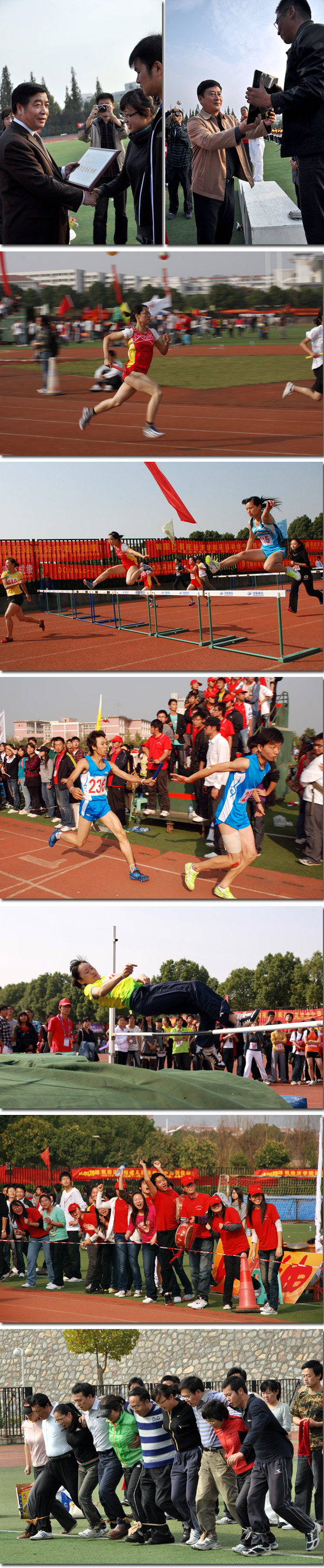 校运会期间,运动健儿意气风发、斗志昂扬;各部门、各学院通力合作,保证了运动会的顺利进行。我们相信,南财人在“自谦自信务实超越”的校训精神鼓舞下,定会不断努力,再创新的辉煌。