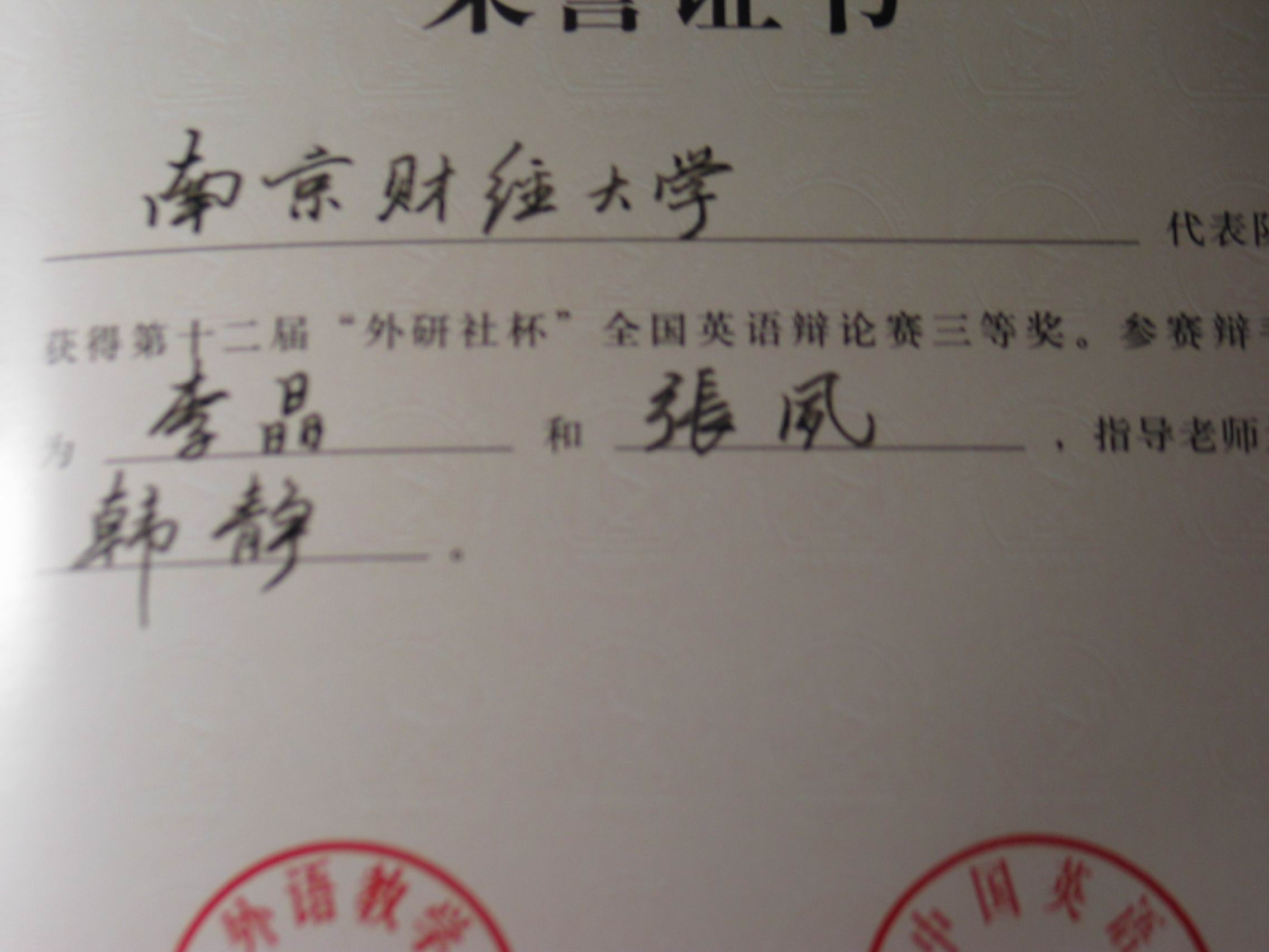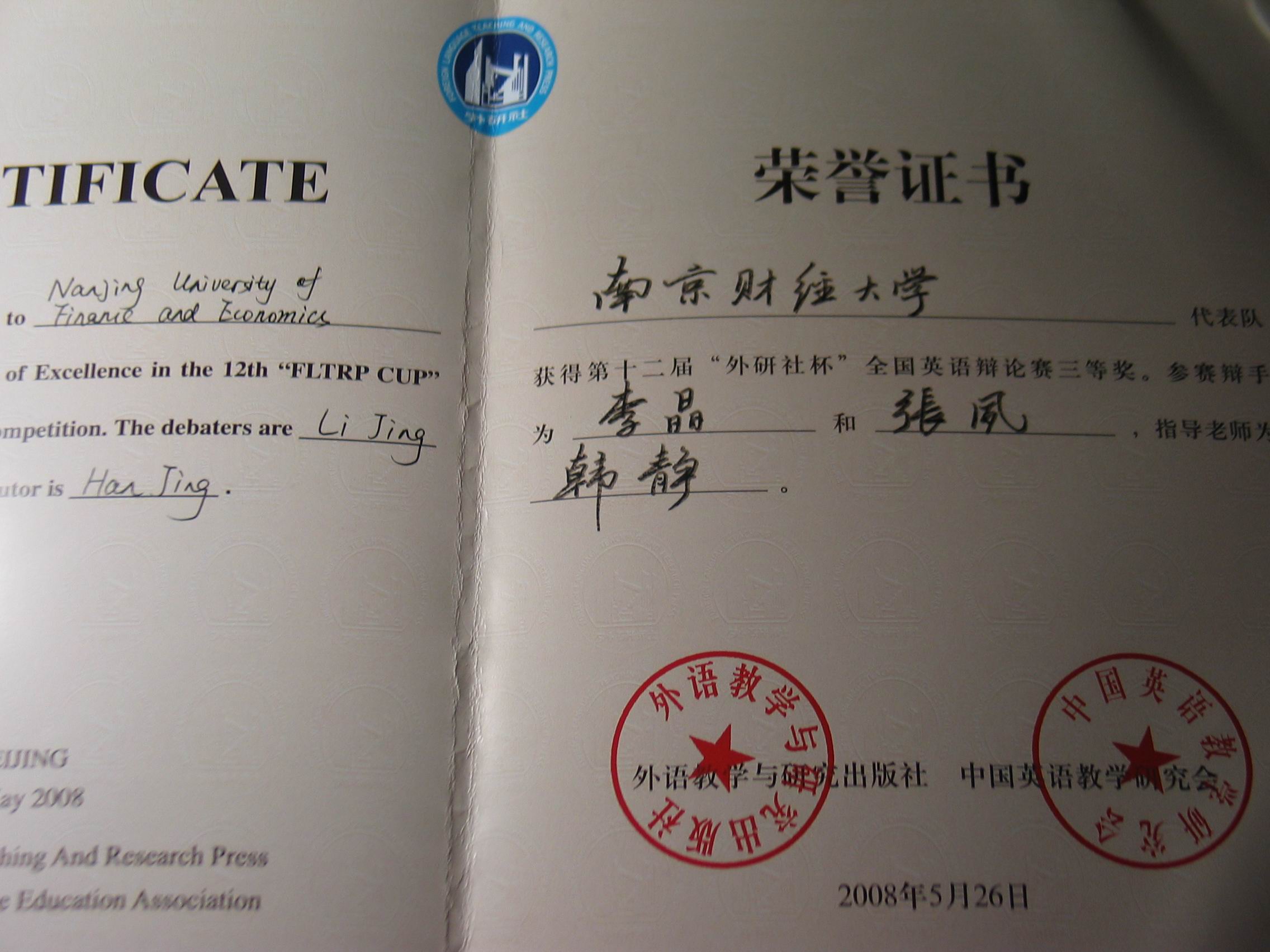 5月24日,我校代表队前往北京参加由外语教学与研究出版社主办的第12届“外研社杯”全国英语辩论赛的两位选手李晶、张夙和指导老师韩静载誉归来。“外研社杯”全国英语辩论赛是全国最权威、最具规模、最有影响力的英语辩论赛事。在此次比赛中,我校荣获三等奖,这是我校迄今为止参加此项赛事以来取得的最好成绩。