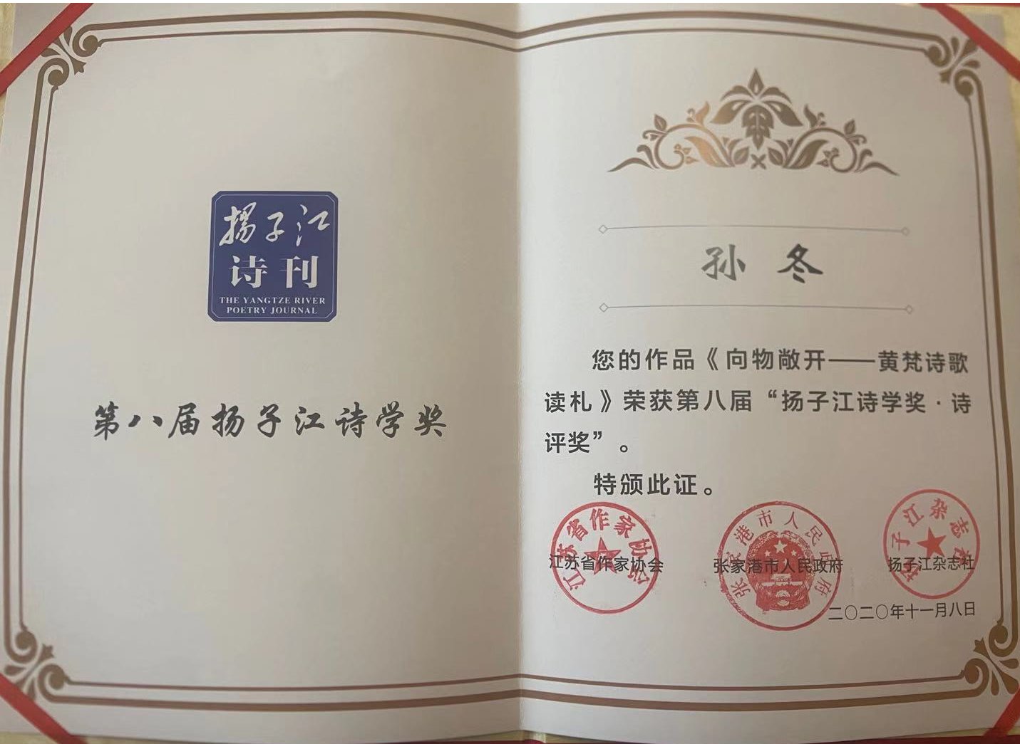 11月16日晚,第九届“长江杯”江苏文学评论奖、第八届扬子江诗学奖在长江文化艺术节闭幕式上颁奖。江苏省作协主席范小青、承办城市领导、省内外著名诗人、评论家,获奖作者代表、师生代表和新闻媒体记者等参加颁奖活动。我校教授孙冬的诗作《向物敞开——黄梵诗歌读札》(《扬子江诗刊》2020年第4期)获扬子江诗学奖,在全国诗歌批评界引起较大反响。