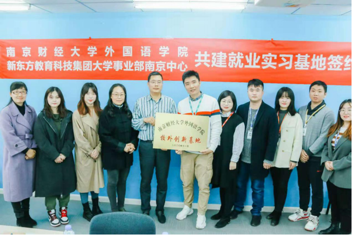 座谈会后,学院党委书记李骏与新东方教育科技集团大学事业部南京中心运营支持高级经理施洁分别代表双方单位签订校企合作协议书,并举行“校外创新基地”授牌仪式。