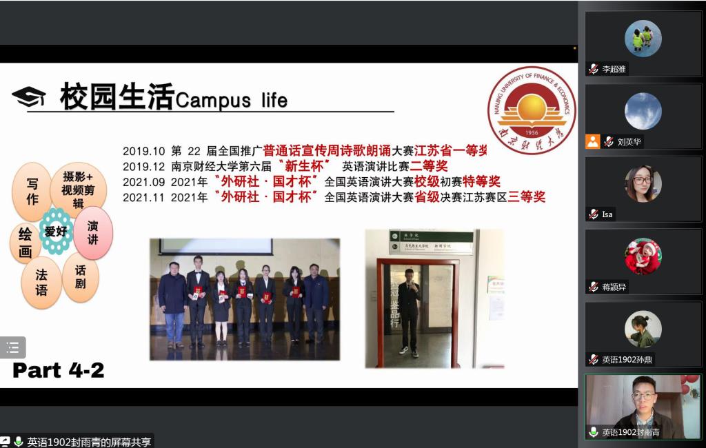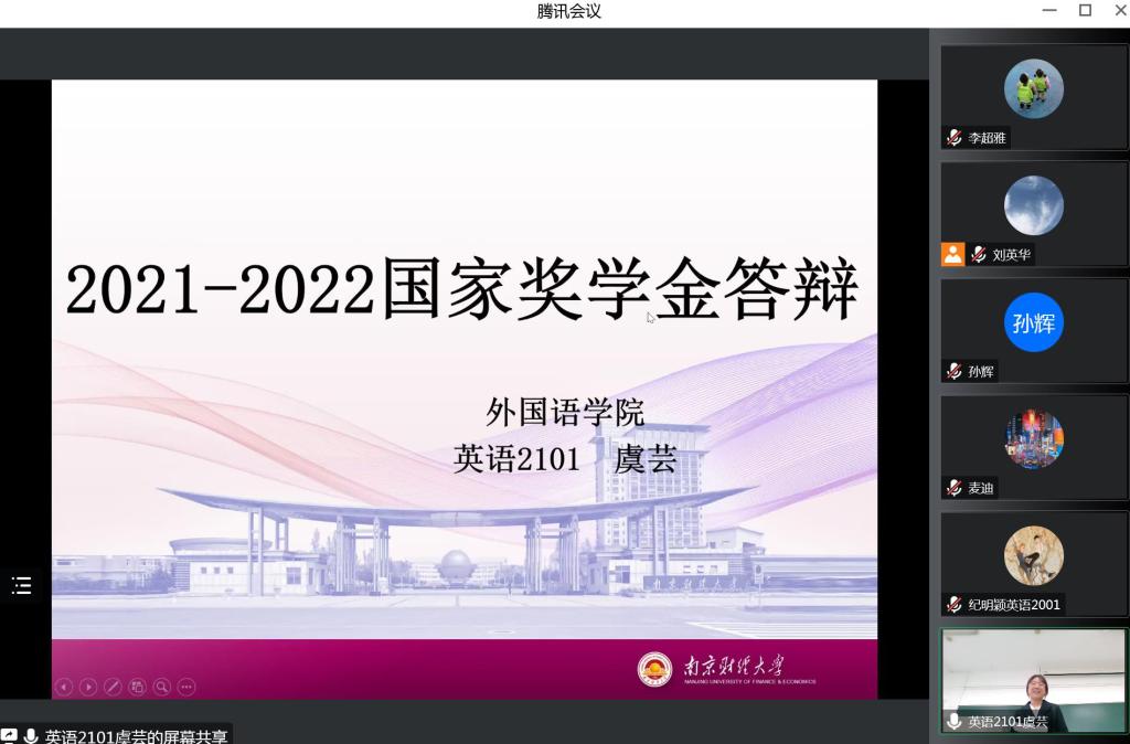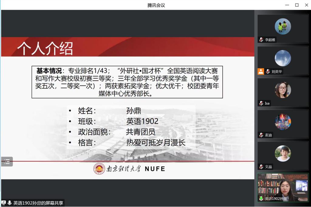 经过前期个人申报和学院初审,来自51吃瓜app 2019、2020、2021级共计4名候选人进入最终的评审环节,按照抽签顺序依次进行答辩。几位候选人分别从思想政治、学业成绩、学科竞赛、社会实践等方面取得的成果进行全方位、多角度的展示。英语1902班孙鼎同学自信、从容、大方,以扎实的专业学习成绩和较强的实践能力给大家留下了深刻印象。