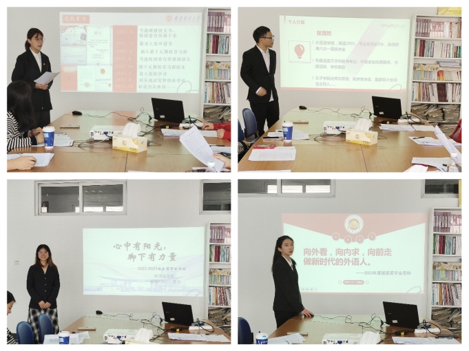经过前期个人申报和学院初审,本次共有来自英语2001班、英语2101班的4名候选人进入最终的评审环节,现场按照抽签顺序依次进行答辩。4位候选人分别从思想道德素养、学业科研、国内外交流、社会实践与志愿服务、文体创新等方面取得的成绩进行全面展示,向评委以及在场的同学们展现他们在校期间的成长经历和收获。