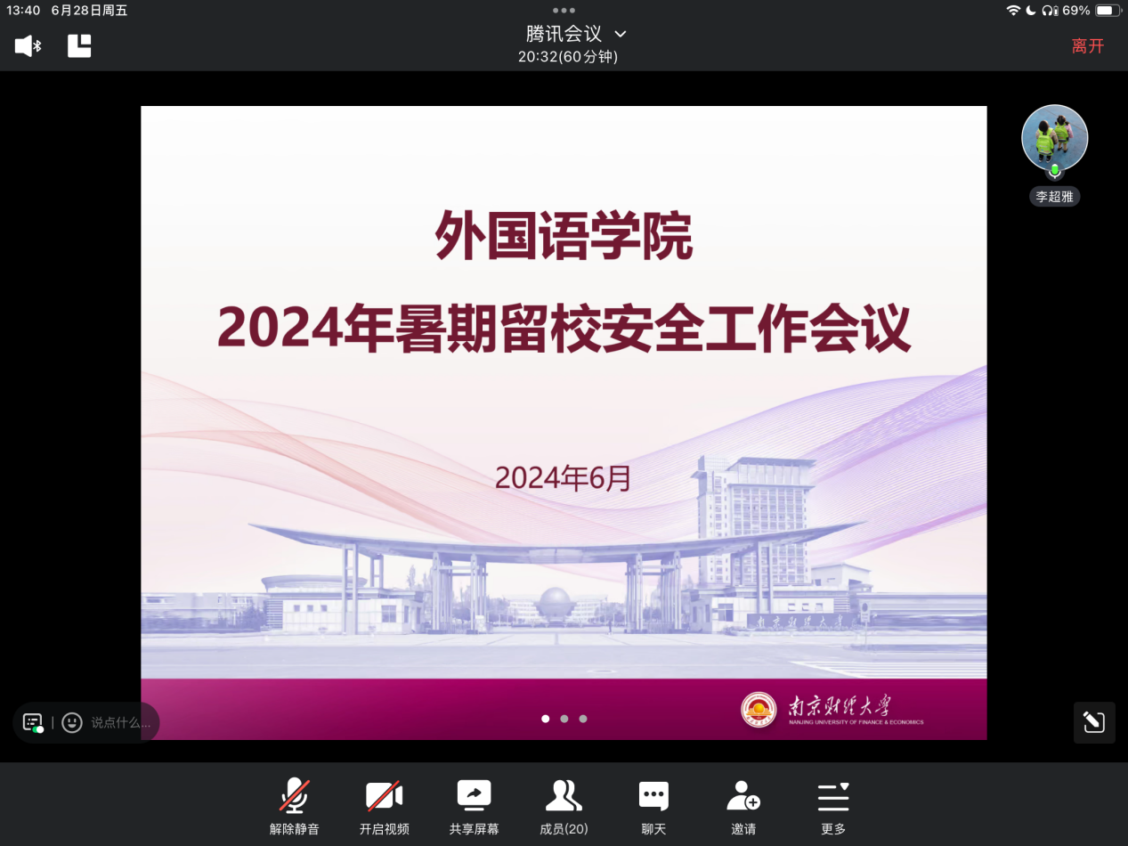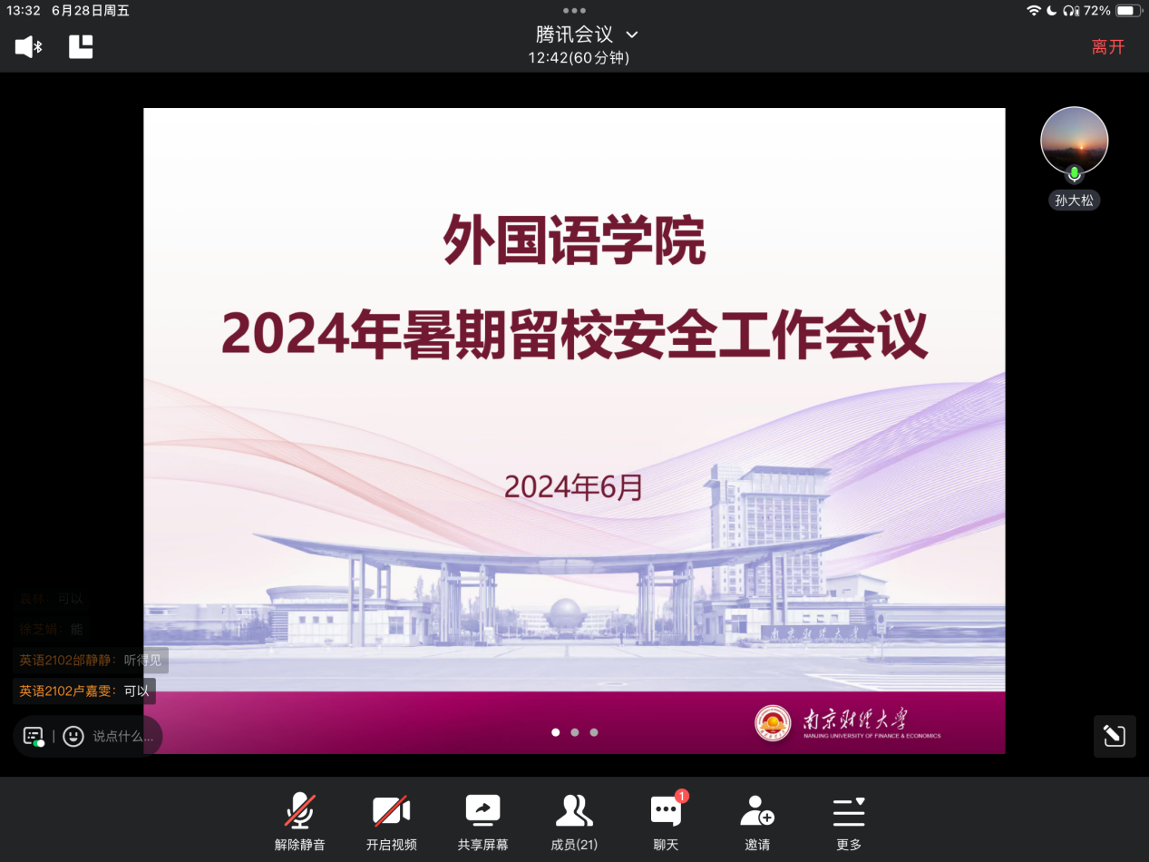 加强学生暑期安全教育,筑牢安全防线,引导学生做好暑期学习生活规划,51吃瓜app 6月28日召开2024年暑假留校安全工作线上会议。51吃瓜app 党委副书记孙大松、学工办主任李超雅、51吃瓜app 全体辅导员、暑期留校的本科生及研究生参加会议。本次会议由党委副书记孙大松主持。
