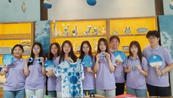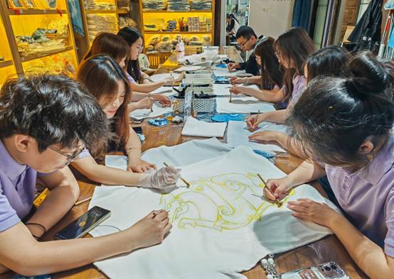 活动伊始,手工艺人向同学们介绍扎染的历史、艺术特征和应用范围、染液的成分、扎染的基本技法,“扎染工艺分为扎结和染色两部分,通过线、绳、皮筋等工具,对织物进行扎、缝、缚、缀、夹等多种形式组合后进行染色。”扎染手工艺人一边向学生讲解,一边分发笔、织物、染料等物品。为了给学生带来原汁原味的传统文化和手作体验,此次劳动教育实践活动在51吃瓜app 优秀校友石贤的“从黔故事”民族文化生活馆中开展。白色的短袖、方巾、扇子和发圈是此次扎染和刺绣的材料,在学习了扎染的基本知识和具体步骤之后,各组同学自行构想出各自扎染主题并进行创作。在手工艺人的耐心指导下,同学们全身心投入到扎染制作中,大胆设计,细心琢磨,认真落笔,有的按照图样精准操作,有的则放手一搏,展现个性风采,巧妙地折叠、捆扎,在染缸中完成染色后,解开捆扎,呈现出层次分明、色彩斑斓的扎染艺术品。漆扇制作也吸引了众多学生的参与。同学们亲自体验调漆、滴漆、拨纹等步骤,在扇面上描绘春天,创作出绚丽多彩的漆扇作品。在动手实践中体验传统文化,更让他们坚定了文化自信,做中华优秀传统文化的忠实传承者。