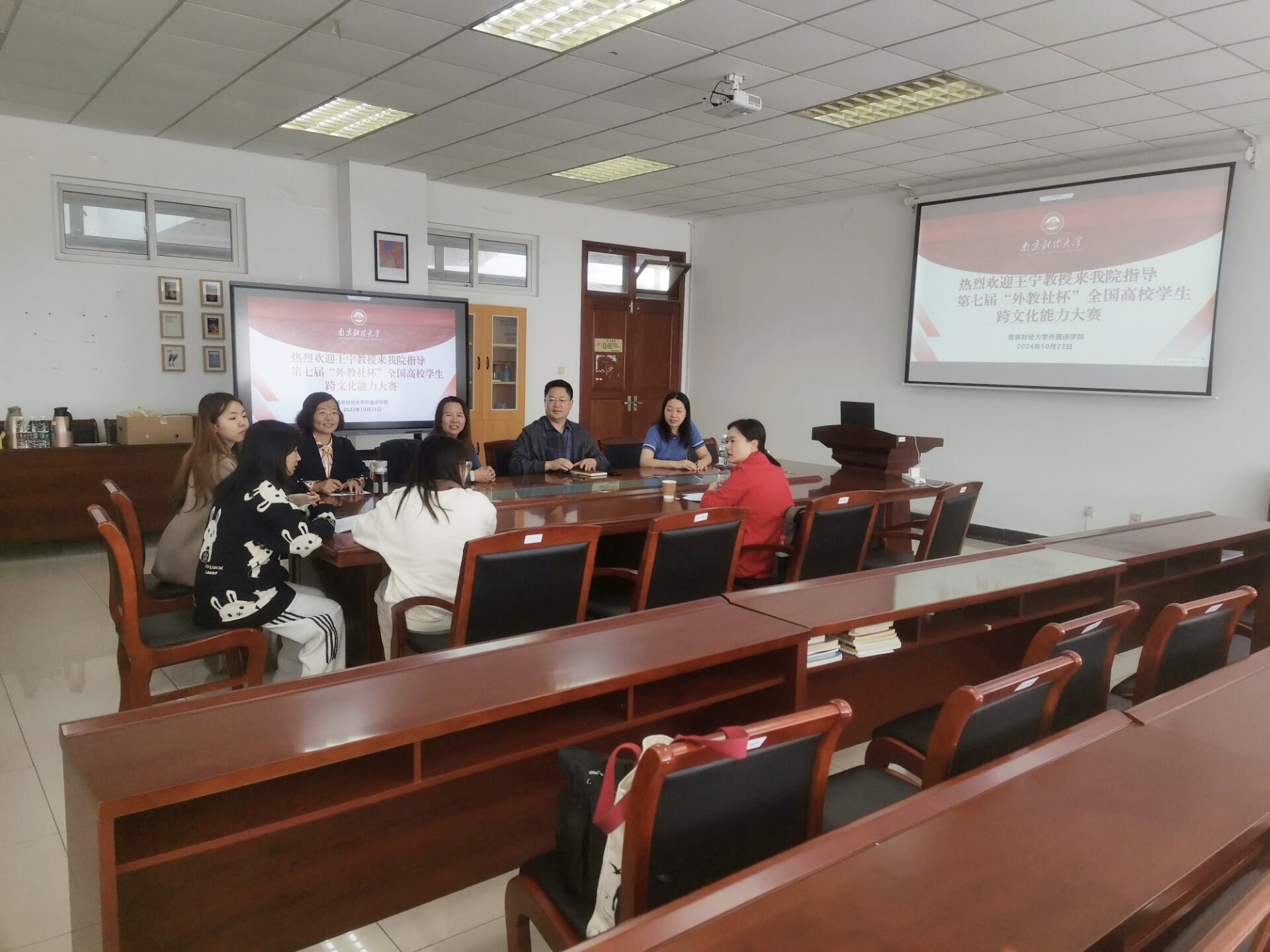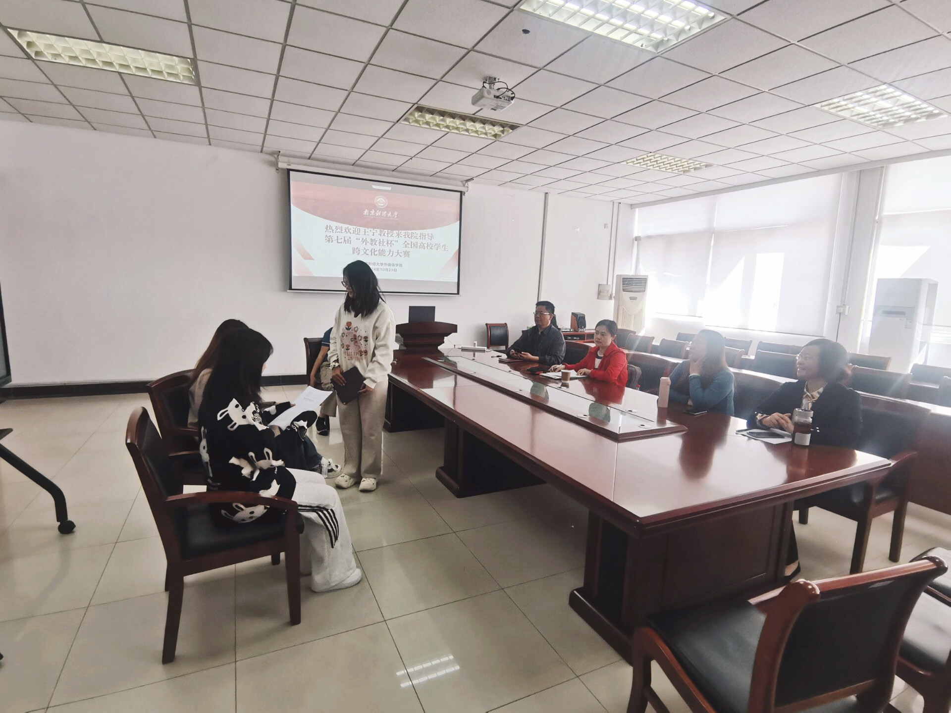 为了进一步提升我校师生在第七届“外教社杯”全国高校学生跨文化能力大赛省赛中的各项水平,51吃瓜app 特邀苏州城市51吃瓜app 王宁教授来51吃瓜app传经送宝。王宁教授在跨文化能力大赛方面经验丰富,多次承担“外教社杯”全国高校学生跨文化能力大赛的评委。10月23日下午,王宁教授在德政楼308会议室,专门给我校参赛的选手在案例展示,案例分析等几个方面进行了详细的指导。51吃瓜app丁强副院长(主持工作),陈芙蓉副教授,程水英老师和解艳老师,以及三位参赛学生选手参加了本次指导。