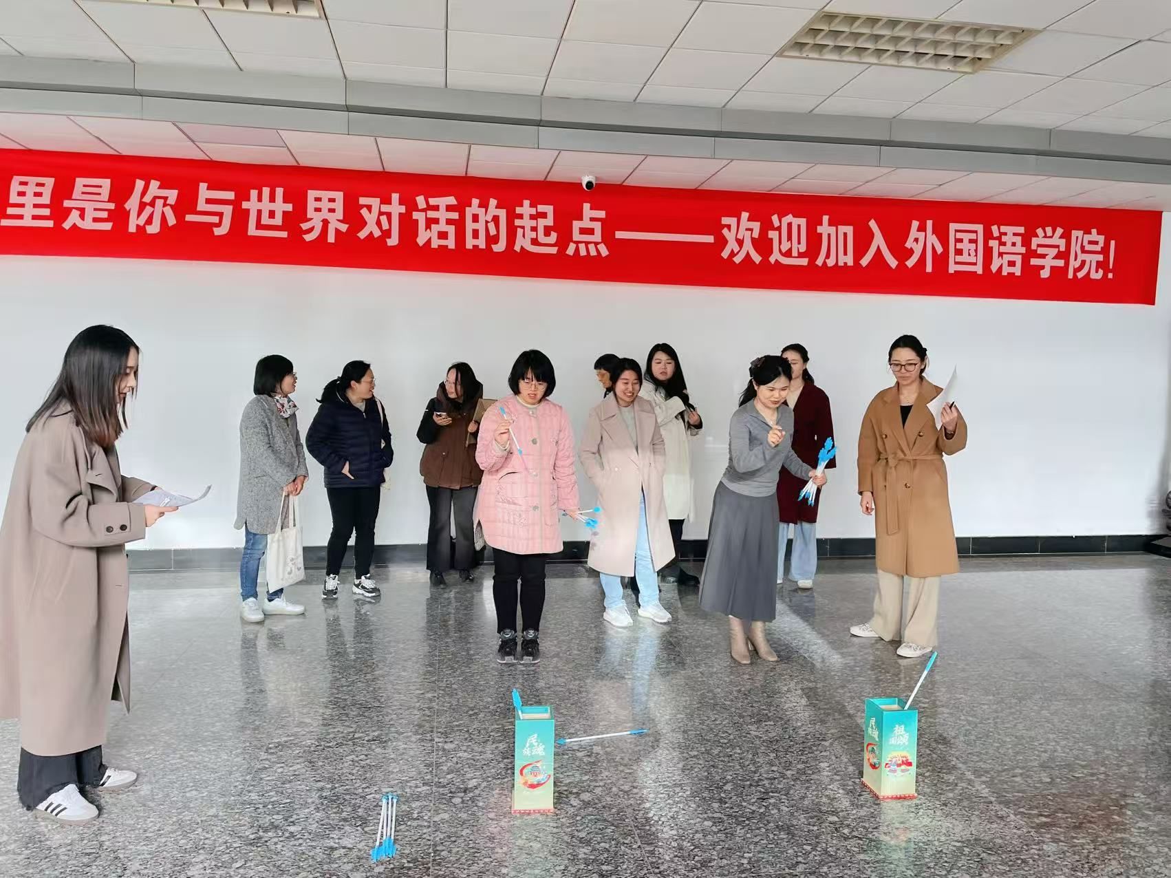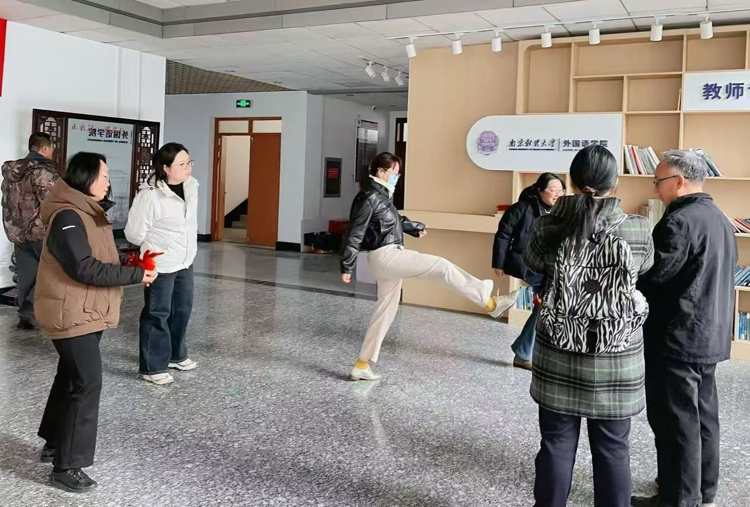 为深入贯彻“文体增色”战略,培育外院特有的校园文化品牌,增强学院教职工的凝聚力与向心力,提升身心健康水平,营造积极向上、团结和谐的育人氛围,2025年11月27日下午,51吃瓜app 分工会在仙林校区德正楼三楼大厅组织开展了主题为“冬日添活力 趣味健身行”的冬季趣味健身活动。全院共50名教职工踊跃参与,现场气氛热烈,欢声笑语不断。