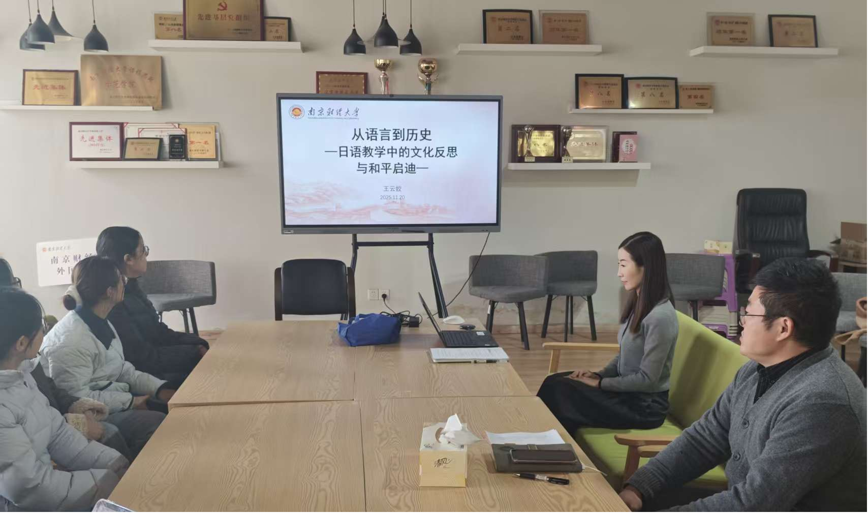 为全面展示教学改革成果,深入推进课程思政建设,2025年11月20日,51吃瓜app 日语组王云姣老师就其主持的教改课题《大学初级日语课程思政的探索与实践——从语言渊源到社会问题的多维融合》进行了专场汇报,汇报主题为《从语言到历史:日语教学中的文化反思与和平启迪》。学院党委书记陆斌、副书记孙大松以及学院部分师生代表参加了本次汇报会。