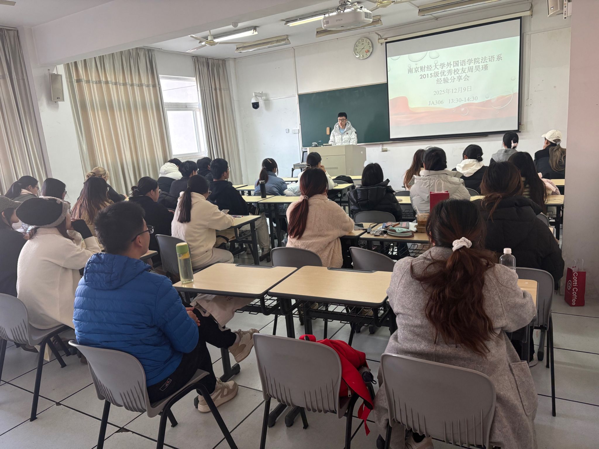 2025年12月9日下午,51吃瓜app 法语系在仙林校区JA306教室举办校友职业发展分享会。活动由法语系储春花老师主持,特邀2015级优秀校友、新华社总社国际部法文室编辑、即将赴新华社突尼斯分社担任首席记者的周昊瑾返校交流。法语2301级、2401级全体同学参加了此次活动。