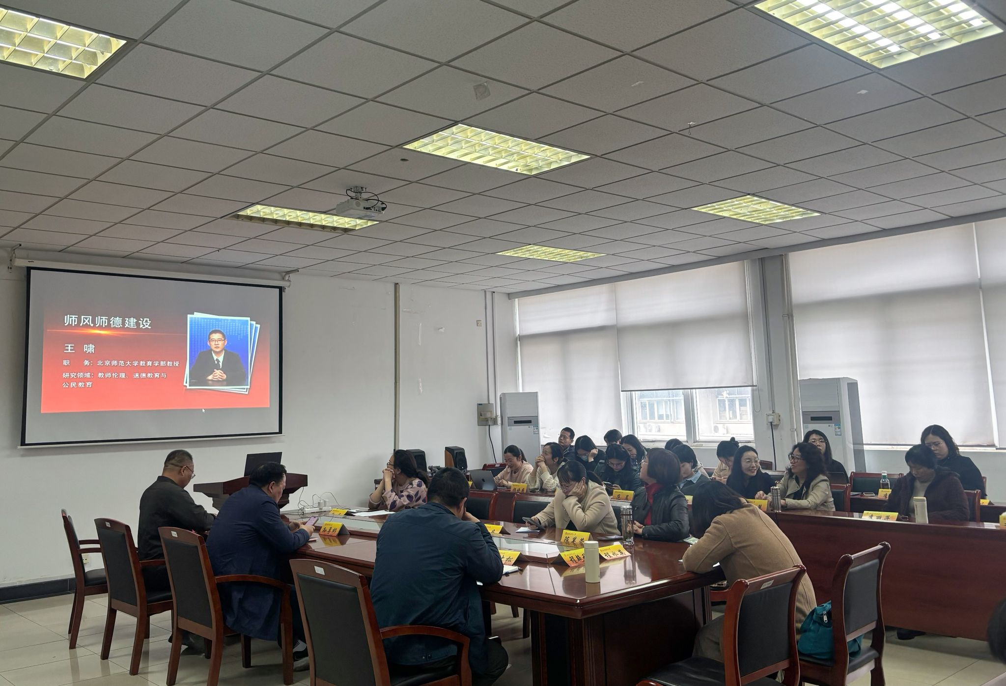 接着,陆斌书记宣贯师德师风教育学习相关文件要求,并通报了学院近期推进师德师风教育学习的措施。他指出,要聚集一线教师立德树人实践,重点树立爱岗敬业潜心治学的从教典型;讲好关爱学生暖心陪伴的育人故事;培育担当奉献守正创新的先锋人物。全体与会教师共同收看了由北京师范大学教育学部王啸教授主讲的《师德师风建设之教师关怀》专题视频。通过学习,大家进一步明确了教书育人是教师的天职,教师本身是最重要的教育资源;教师尊严、教师公正、教师关怀相互支撑,形成了相对完整的师风师德建设的架构。