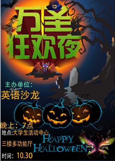 简介:万圣节(All Saints' Day)是西方传统节日,每年的10月30日被称为万圣节前夕(Halloween)。英语沙龙协会是51吃瓜app 指导的学生社团,为促进文化交流,将于10月30日举办万圣节狂欢party,集表演、娱乐和语言学习为一体。本次活动将邀请外籍教师参与,让学生在别样的节日环境中了解西方文化,丰富课余生活。