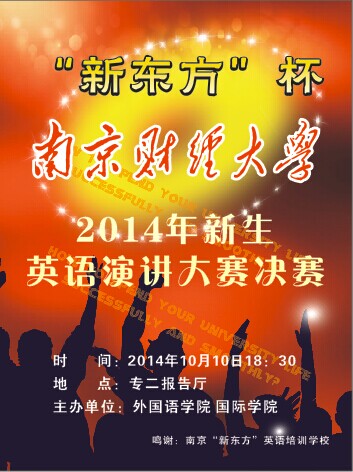 我校2014级新生英语演讲大赛共有三百余名新生报名参赛,经过前期的两轮比赛,有21名新生晋级决赛,现将决赛具体事宜通知如下: