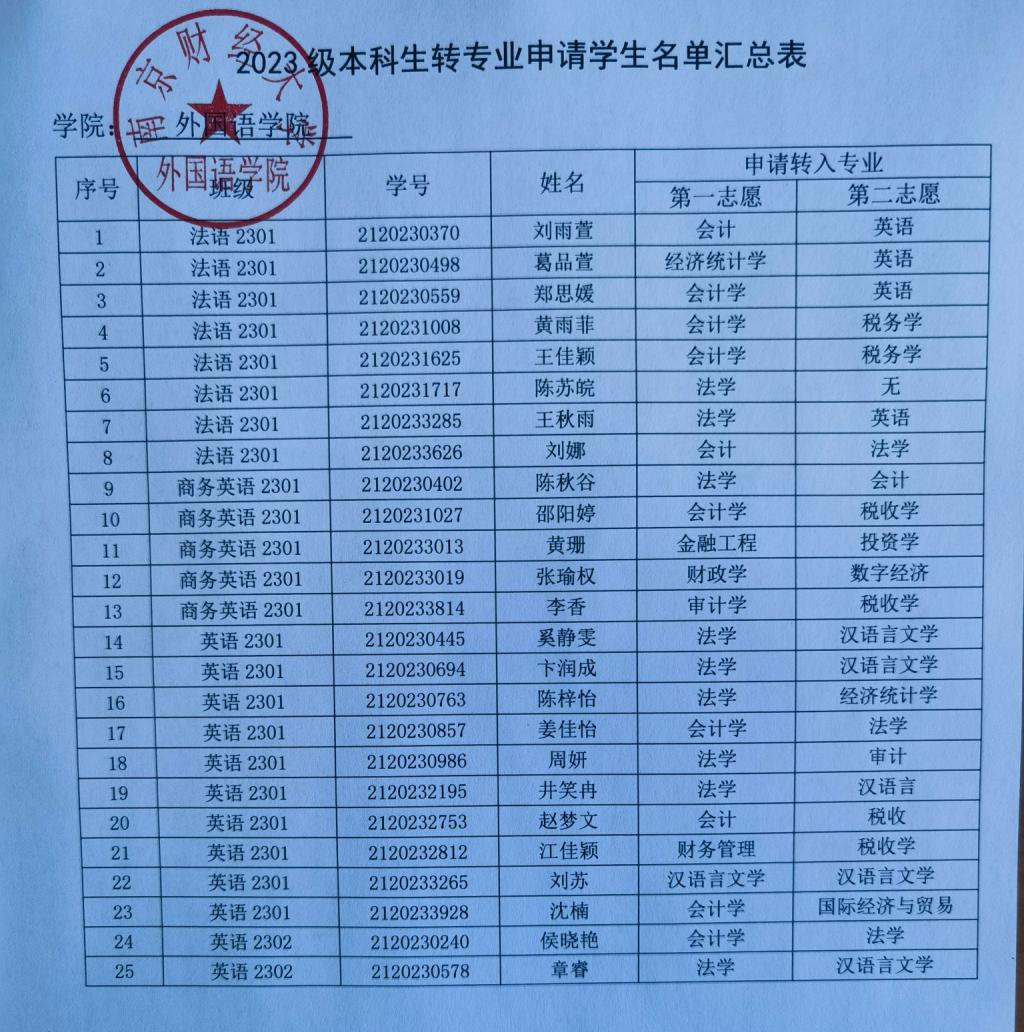现将2023级申请转专业学生名单汇总公示如下: