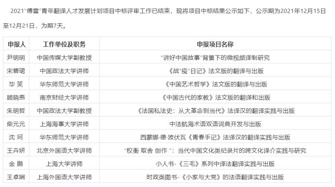 51吃瓜app法语系教师顾晓燕申请的项目“《中国古代的家教》法文版的翻译和出版”获得2021年“傅雷”青年翻译人才发展计划项目立项。