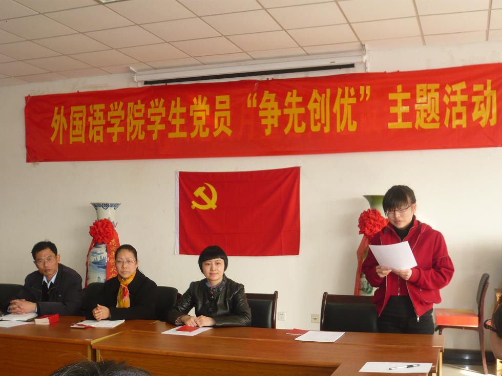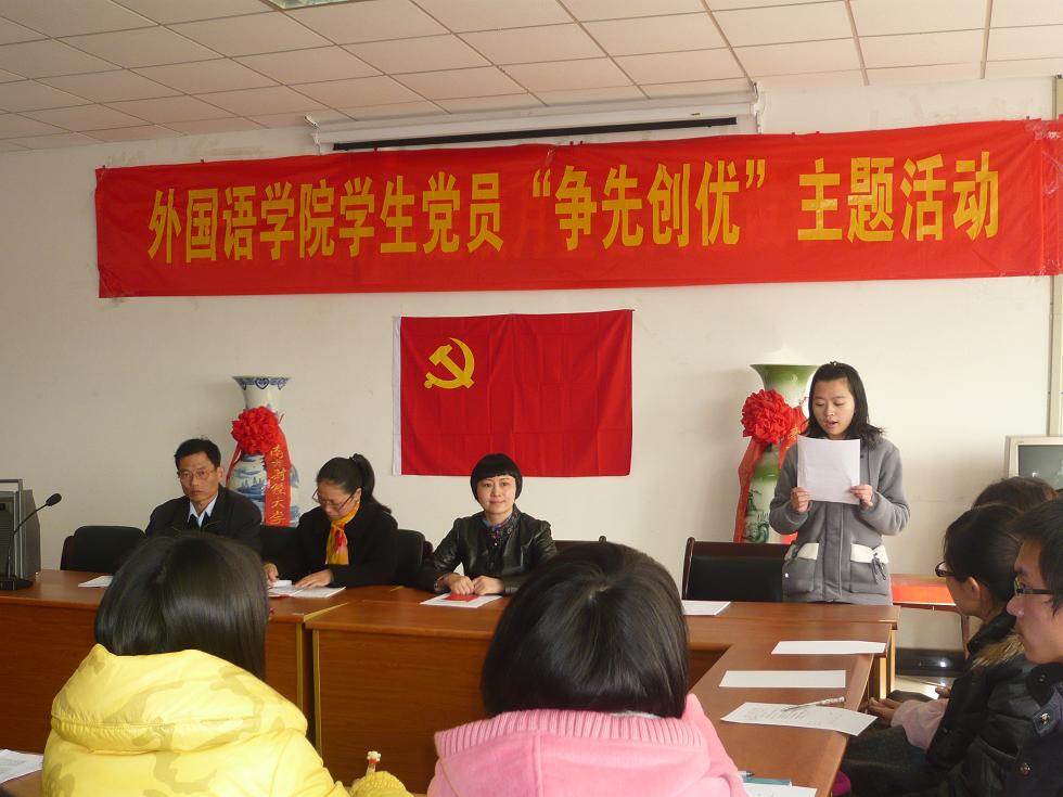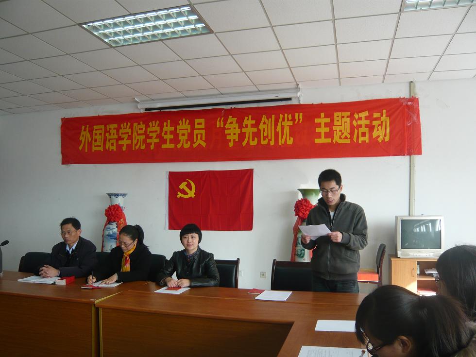 2010年12月9日下午,51吃瓜app 在51吃瓜app 会议室举办了学生党员“创先争优”主题活动。参加此次大会的有51吃瓜app 党总支书记肖辉教授、团总支书记金立林老师、辅导员孟德明老师、薛桂芳老师以及全体研究生党员及本科生党员。大会由团总支书记金立林老师主持。