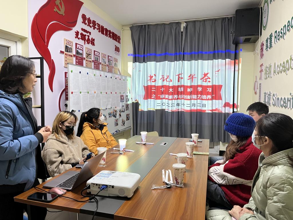 李骏书记以“审美素养与创新能力培养”为题带领学生代表们进行党的二十大精神的学习。她从党的二十大报告中关于“创新”的阐述与要求谈起,追溯“什么是创新”“什么是创新型人才”,从英语词源学视角探索了“创新”的内涵。继而,就“如何培养创新能力”这一问题,李骏书记从“艺术与创新能力”两者之间的关系谈起,以生动的案例、真实的调研数据,分析了艺术培养创新能力的原因与路径。她倡导同学们培养丰富的审美想象、激发独特的审美情感、形成正确的审美观点,以此不断练就自身的创新能力。