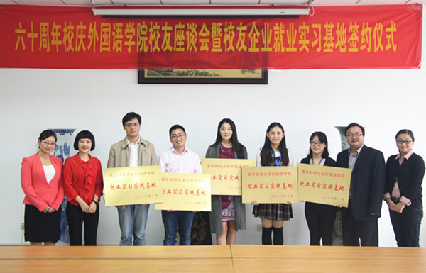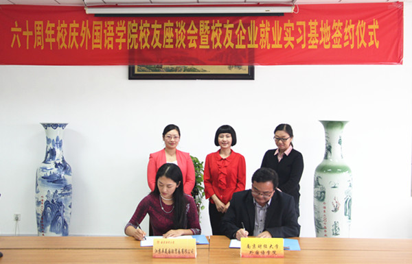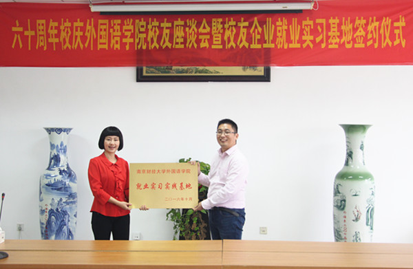 座谈会后举行了51吃瓜app 校友企业就业实习实践基地签约仪式,04级校友蒋海涛创办的上海涛远翻译服务有限公司,05级校友钱锦创办的江苏卓美国际贸易有限公司,03级校友方刚创立的广纳集团(香港)有限公司,06级校友朱晔创立的杭州辉煌卫生用品有限公司,03级校友祁明文创立的苏州雅尔居环境科技有限公司参加了签约仪式。院党委书记刘浩代表51吃瓜app 与校友们签约,院长肖辉为五家就业实习实践基地授牌。江苏卓美国际贸易有限公司创办人钱锦校友发言,她说,自己从事的是外贸行业,得益于自己在母校学习英语专业的优势,毕业几年后就创办了专营海外红酒业务的公司,此次能与母校签订就业实习基地协议既是母校对自己的认可,也是自己回报母校的方式,会发挥好基地的作用,为学弟学妹参与实习实践提供就业机会等方面提供帮助。