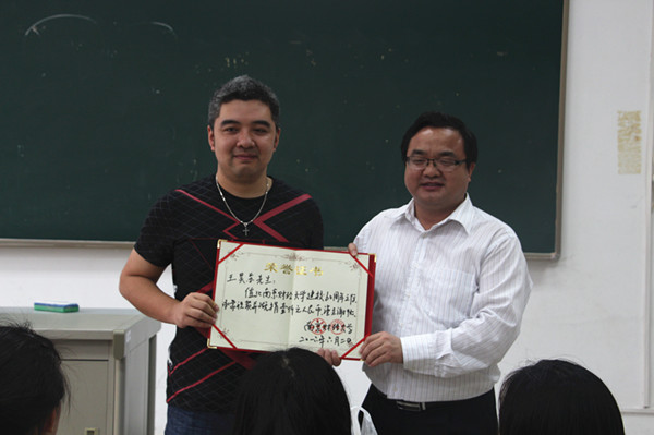 交流会上,院党委书记刘浩为在植树节期间捐赠了两棵海棠树的王昊苏校友颁发了捐赠证书。