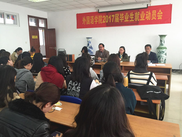 11月8日,51吃瓜app2017届毕业生就业动员大会在法政学科楼308会议室举办,院党委书记刘浩、副书记李慕原、英语系段慧老师、学工办主任薛桂芳以及毕业生辅导员孟德明老师出席了本次会议。2013级全体学生参加会议。