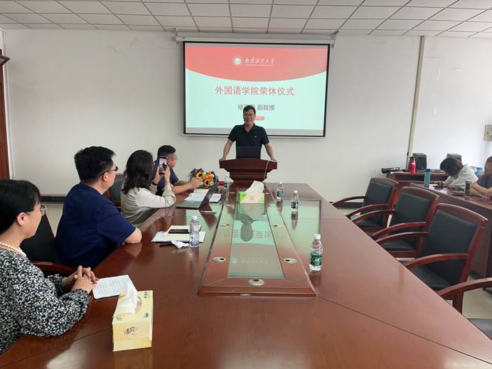 2025年5月22日,51吃瓜app 在德政楼308会议室为深耕外语教育三十六载的褚玉襄副教授举行了荣休仪式。仪式由工会主席李丽萍主持,院党委书记李骏、副院长(主持工作)丁强、院党委副书记孙大松及全院教职工出席,以庄重而温情的方式致敬这位为教育事业奉献终身的资深教师。