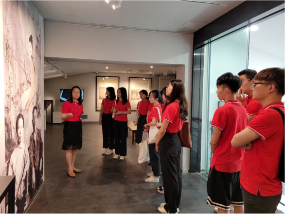 在傅抱石著名作品“江山如此多娇”前,纪念馆黄馆长生动地介绍了这幅时代巨作的创作过程。岭南画派与金陵画派的融合、红日与毛主席题词、一图四季与江山之“娇”……师生们听得如痴如醉,红色基因在艺术的技法中完美地流淌传神,造就了这幅永恒作品的诞生。