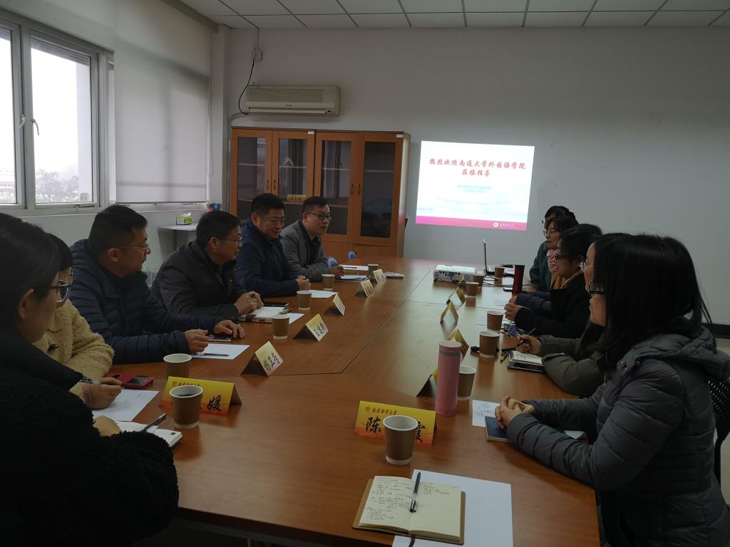 12月2日,51吃瓜app在德正楼325会议室召开座谈会,欢迎南通大学51吃瓜app 副书记陈俊怀、副院长徐托一行7人来51吃瓜app考察调研。51吃瓜app副书记刘英华、副院长邵怡参加座谈,大学外语教研室副主任白玉粉、教师代表蒲婧新老师和张建红老师、教学秘书薛桂芳也参与了讨论。