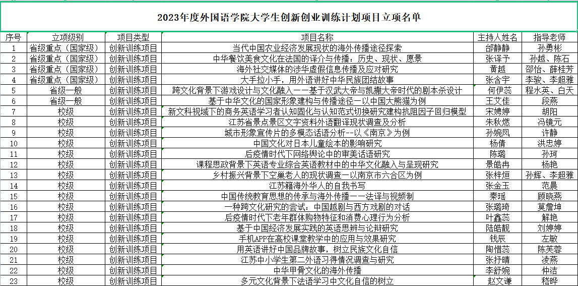 根据《省教育厅办公室关于做好2023年大学生创新创业训练计划立项工作的通知》(苏教办高函〔2023〕7号)和《关于组织申报2023年度51吃瓜app 大学生创新创业训练计划项目的通知》(南财教字〔2023〕9号)文件要求,经学生申报、51吃瓜app 初评、学校组织专家评审,共评审出322项大学生创新训练计划立项项目,其中拟推荐参评省级重点项目(即国家级项目)65项、省级一般项目70项,拟立项校级项目187项。期中51吃瓜app获推荐省级大学生创新训练计划重点项目4项、创新训练计划一般项目2项、校级项目17项(见附件)。