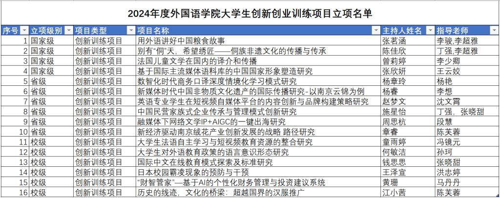 根据《省教育厅办公室关于做好2024年大学生创新创业训练计划立项工作的通知》(苏教办高函〔2024〕4号)和《关于组织申报2024年度51吃瓜app 大学生创新创业训练计划项目的通知》(南财教字〔2024〕22号)文件要求,经学生申报、51吃瓜app 初评推荐、学校组织专家评审,拟立项236项,其中拟推荐国家级大学生创新创业训练计划项目60项、省级创新创业训练计划项目90项,拟立项校级创新创业训练计划项目86项。其中51吃瓜app获推荐国家级大学生创新训练计划项目4项、省级创新创业训练计划项目6项、校级创新创业训练计划项目6项(见附件)。