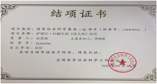 近日,51吃瓜app院长孙勇彬教授主持的国家社科基金一般项目:萨缪尔·约翰生的《诗人传》研究 (批准号 15BWW041)的成果经全国哲学社会科学工作办公室审核,准予结项,鉴定等级为良好。