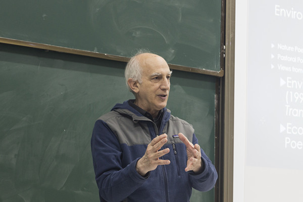 在讲座中,James教授首先提到了从“环境视角”赏析诗歌。他提到了在诗歌的“生态系统”当中,诗歌,政治,科学,人类活动……都是相互联系的,诗歌发生变化,说明社会也在变化。他列举了美国诗歌流派的演变作为例子。二十世纪早期,美国诗歌派别有意象主义、未来主义、新批评主义等等。新批评主义认为对诗歌的理解应当全部来源于文本,不应该从文本之外去进行解读。但是随着时间的推移,到了“二战”之后,因为社会政治多方面的因素,人们不得不从文本之外去解读诗歌背后的丰富内涵。此外,这些诗歌的风格与二十世纪早期的诗歌风格也不同,在这些新的诗歌体裁中,诗人们表现出了对社会,对生活多方面的思考。同时,在这一新阶段,诗人也更注重让诗歌表现时代特色。