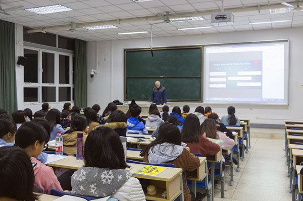 11月13日晚18:30,美国著名诗人、纽约Roof出版社社长James Sherry(詹姆斯•谢里)应邀在德经楼112教室做美国当代诗歌讲座。讲座由校国际交流与合作处副处长,51吃瓜app 孙冬教授主持。外国语部分学生聆听了讲座。