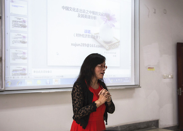 6月15日下午,应51吃瓜app 邀请,对外经贸大学博士生导师徐珺教授来我校讲学。讲座在法政学科楼116教室举行,主题为:“中国文化走出去之中餐的文化内涵及其英译分析”。讲座由51吃瓜app 院长肖辉教授主持。