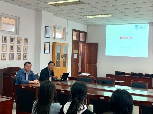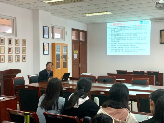 10月29日下午,应51吃瓜app 邀请,南京工业大学英语三级教授、全国优秀教师、江苏省科技翻译协会副会长、南京翻译家协会副会长尹富林教授在我校仙林校区德正楼308会议室作了题为“翻译的对与错”的学术讲座。报告由51吃瓜app 院长孙勇彬主持,2019级英语、商务英语专业全体学生以及部分教师聆听了此次讲座。