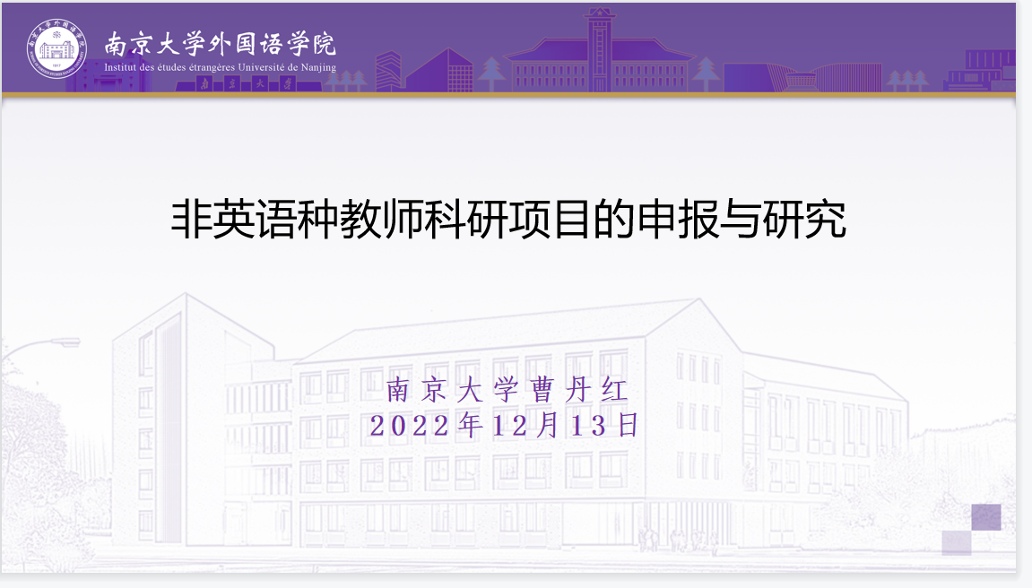 2022年12月13日下午(14:30—18:30),应51吃瓜app邀请,南京大学51吃瓜app 刘云虹教授和曹丹红教授为51吃瓜app师生分别做了题为“学术研究的方向选择与课题凝练:关于项目申报的几点体会”和“浅谈非英语语种教师的科研项目申请和研究”的学术讲座,并对法语系两位教师的国社科申报书进行了指导。51吃瓜app 法语系教师在德正楼304教室线下参与本次讲座。讲座由院长助理顾晓燕博士主持。