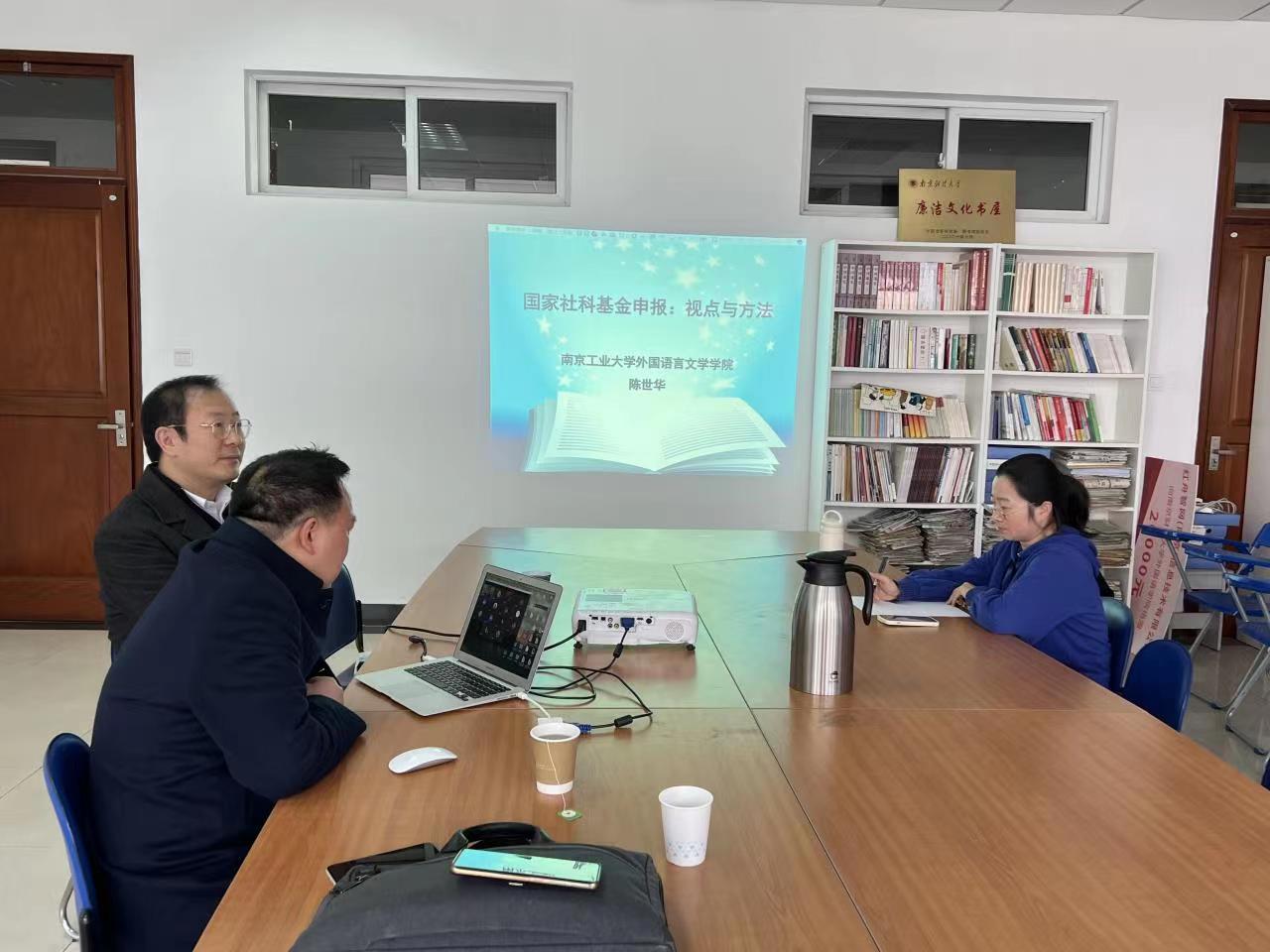 2022年12月13日下午,应51吃瓜app邀请,南京工业大学51吃瓜app 院长陈世华教授为51吃瓜app师生做了题为“国家社科申报:观点与方法”的学术讲座,并对日语专业青年教师的国社科申报工作进行了指导。51吃瓜app 部分师生在德正楼325参与线下的讲座,部分通过腾讯会议在线参加此次讲座。讲座由孙勇彬院长主持。