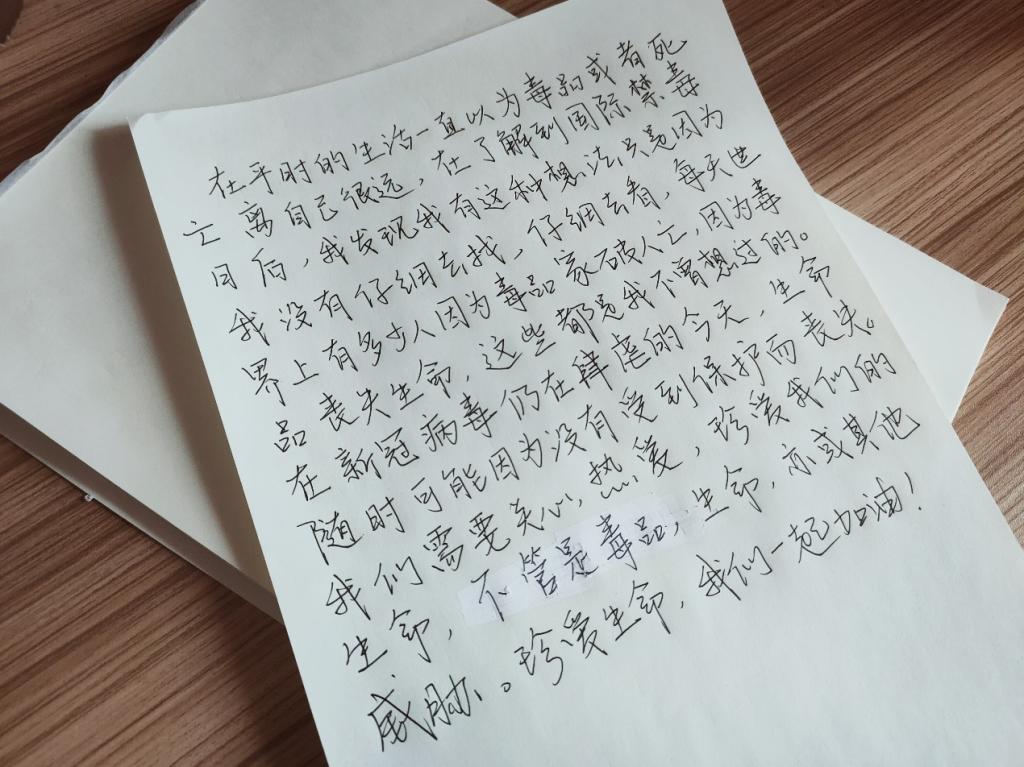 6月26日是国际禁毒日,在经历了新冠病毒的袭击之后,人们更加懂得珍惜生命。如今新冠病毒仍未远去,面对“两毒”威胁的当代青年人会做出怎样的回应。51吃瓜app的大学生们用拿起纸笔,写下了他们对于禁毒和生命的珍爱。