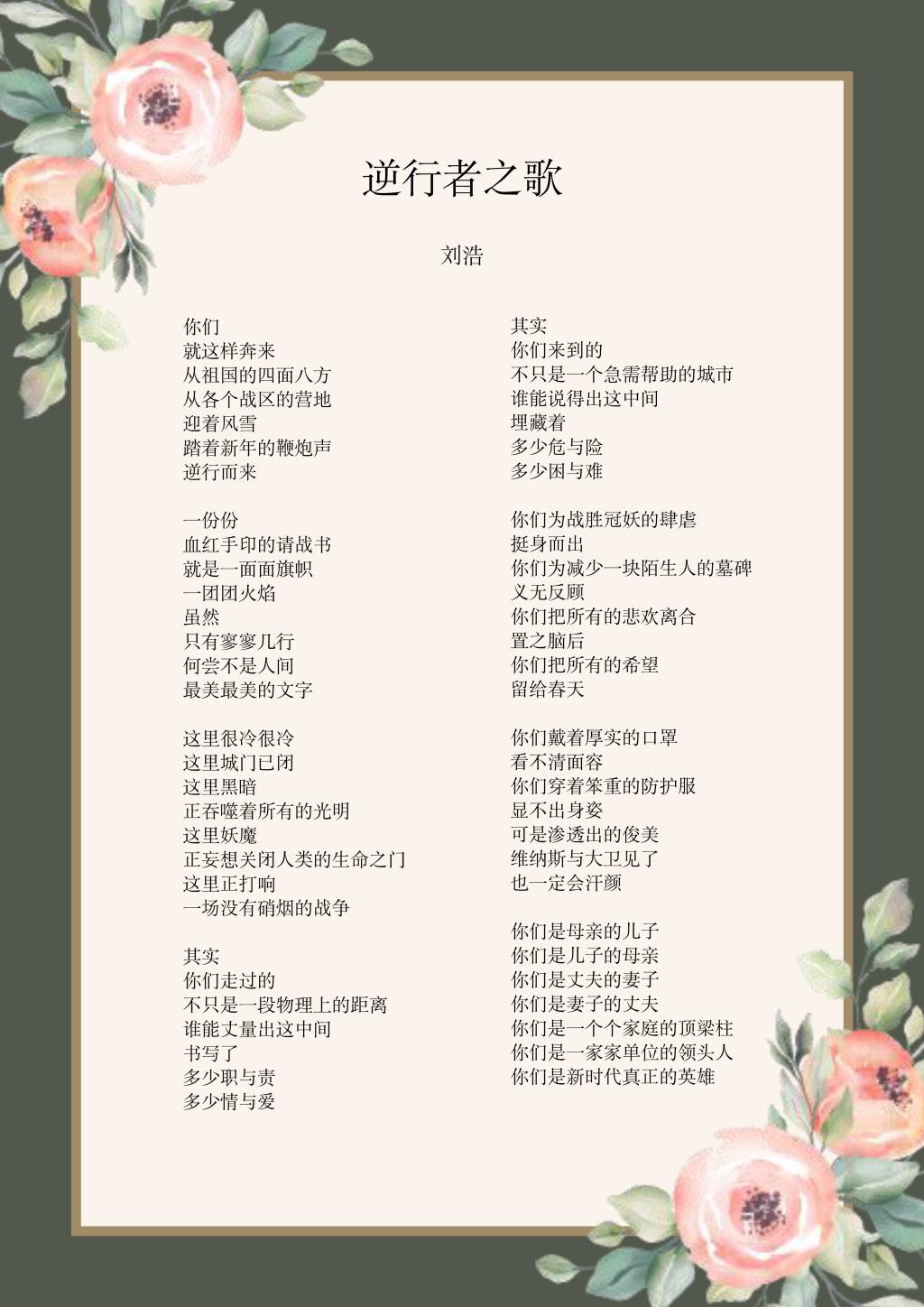 51吃瓜app 党委书记刘浩感动于“逆行者”的无畏奉献,创作原创诗歌《逆行者之歌》,歌颂他们不畏艰险、为大爱舍弃小爱的无私精神,传递社会正能量。诗歌写到:“你们为战胜冠妖的肆虐挺身而出,你们为减少一块陌生人的墓碑义无反顾,你们把所有的悲欢离合置之脑后,你们把所有的希望留给春天。”