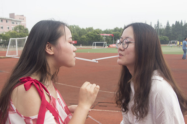 之后就是本次团辅活动中最吸引人的一个环节——吸管传发圈。同学们被分为两组,每组同学都需要用嘴中叼着的吸管将发圈从第一个人传到最后一个人。吸管传发圈不仅考验同学们的耐心,更考验同学们之间的团结协作能力,最重要的是,它将同学们的距离缩短到两根吸管的长度,极大程度上减少了同学们之间的陌生感。