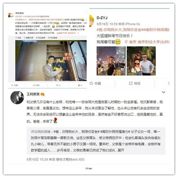 活动推出后,该条微博就得到了很多响应。同学纷纷转发微博,附上评论和一张又一张年代感十足的照片。那些照片中的父亲正值青春,风华正茂。然而,不少网友发现,自己和父亲并没有两人之间的合照。网友“王利发发”说:“他沉默寡言,我寡言少语,倒真是父女……虽然有些不好意思说出口,但我是爱他的。爸爸,辛苦了”。很多人是在严父的管教下成长的,与父亲之间总有隔阂,这也是父爱的独特之处。