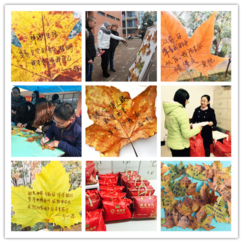 当天中午,学生会的同学们在东苑餐厅前支上长桌,摆放上同学们精心收集的梧桐落叶,活动吸引了许多师生参与,留学生也加入进来。感恩节前,51吃瓜app 就已经开始了三行箴言的征集活动。同学纷纷投稿,表达自己的感恩之情。在这些感恩三行诗中,有对父母、亲人的思念,有对同学、师长的感激。有人简单明了地表达了爱意,有人写下了富有哲理的三行短诗。经过筛选之后,优秀的作品都被写在了梧桐树叶上。