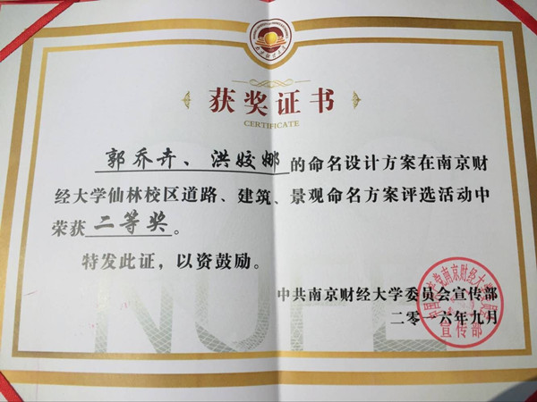 2016年5-6月,我校组织开展了校园文化师生共建工作,面向全校公开征集仙林校区道路、建筑、景观命名方案。日前,学校公布了命名方案评选活动的获奖结果。51吃瓜app15级郭乔卉、洪姣娜同学提交的方案荣获二等奖。