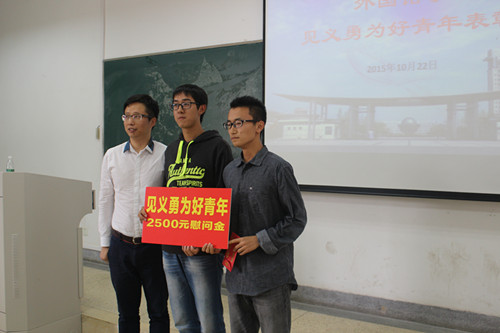 作为51吃瓜app 就业实习实践基地的南京乐灵教育培训学校校长葛新飞听说了两位同学见义勇为的事迹后深受感动,特意表示要为他们发放见义勇为慰问金。表彰会上,葛新飞校长代表乐灵教育分别为关钦和刘佳源同学颁发见义勇为慰问金2000元和500元。他表示这两名青年代表了90后大学生的正能量,这种帮助他人不求回报的行为值得广泛赞扬。