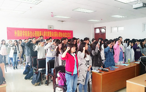 随后,外院向日葵心理协会会长徐鹏英同学发言并带领全体15级新生宣读入会宣誓。她表示作为第一任会长,她会明确职责,认真工作,用心服务同学。新生在会长的带领下庄严宣誓,承诺在日常学习生活中,努力认识自我,改变自我,发展自我。